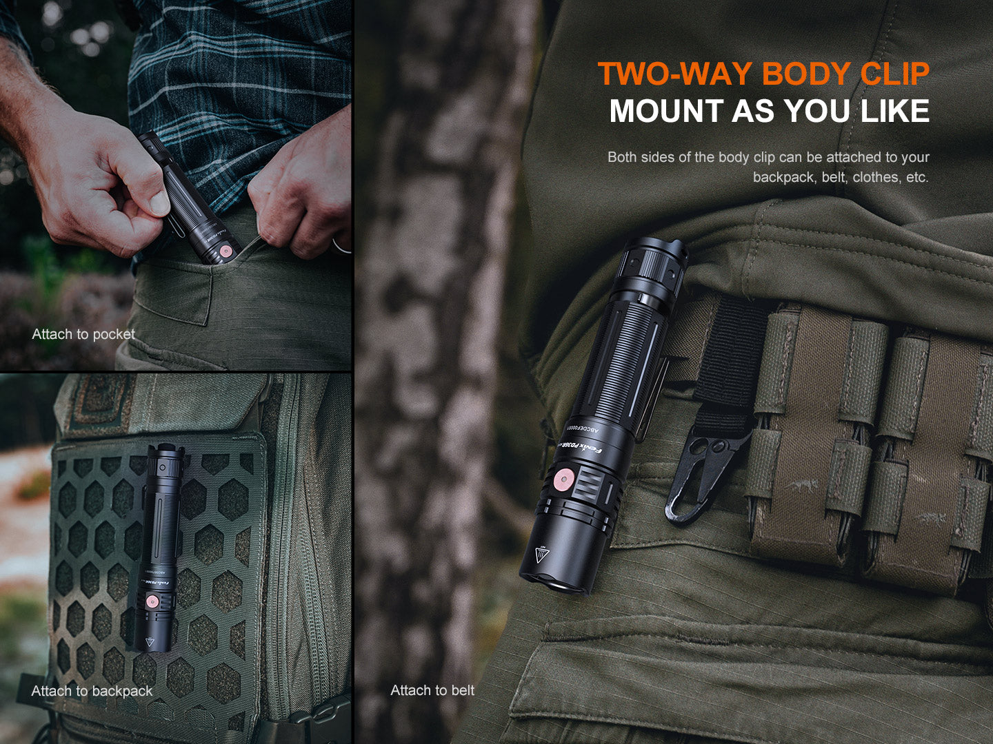 Illuminate the night with the Fenix PD36R V2, a high-end flashlight designed for those who demand unmatched reliability and performance. Project a powerful 1700 lumens of brightness up to an impressive 396-meter beam throw, ensuring that every path you take is brightly lit and clear. The Fenix PD36R V2 offers the convenience of USB Type-C charging, including 18W fast charging that rejuvenates your flashlight to full power in a mere 2.5 hours. With an astounding 60-day runtime, this flashlight is an invaluable companion for extended outdoor adventures, ensuring you're never left in the dark. It’s meticulously designed with a versatile 2-way body clip for effortless attachment, allowing for hands-free carry whenever needed. No environment is too harsh for the Fenix PD36R V2 as it boasts a remarkable waterproof rating of IP68, ensuring optimum functionality even in the wettest conditions. Even with the dust cover removed, the flashlight’s inner waterproofing keeps water at bay, upholding the integrity and performance of your device. Choose the Fenix PD36R V2, and step into a world of unrivaled illumination and enduring quality.