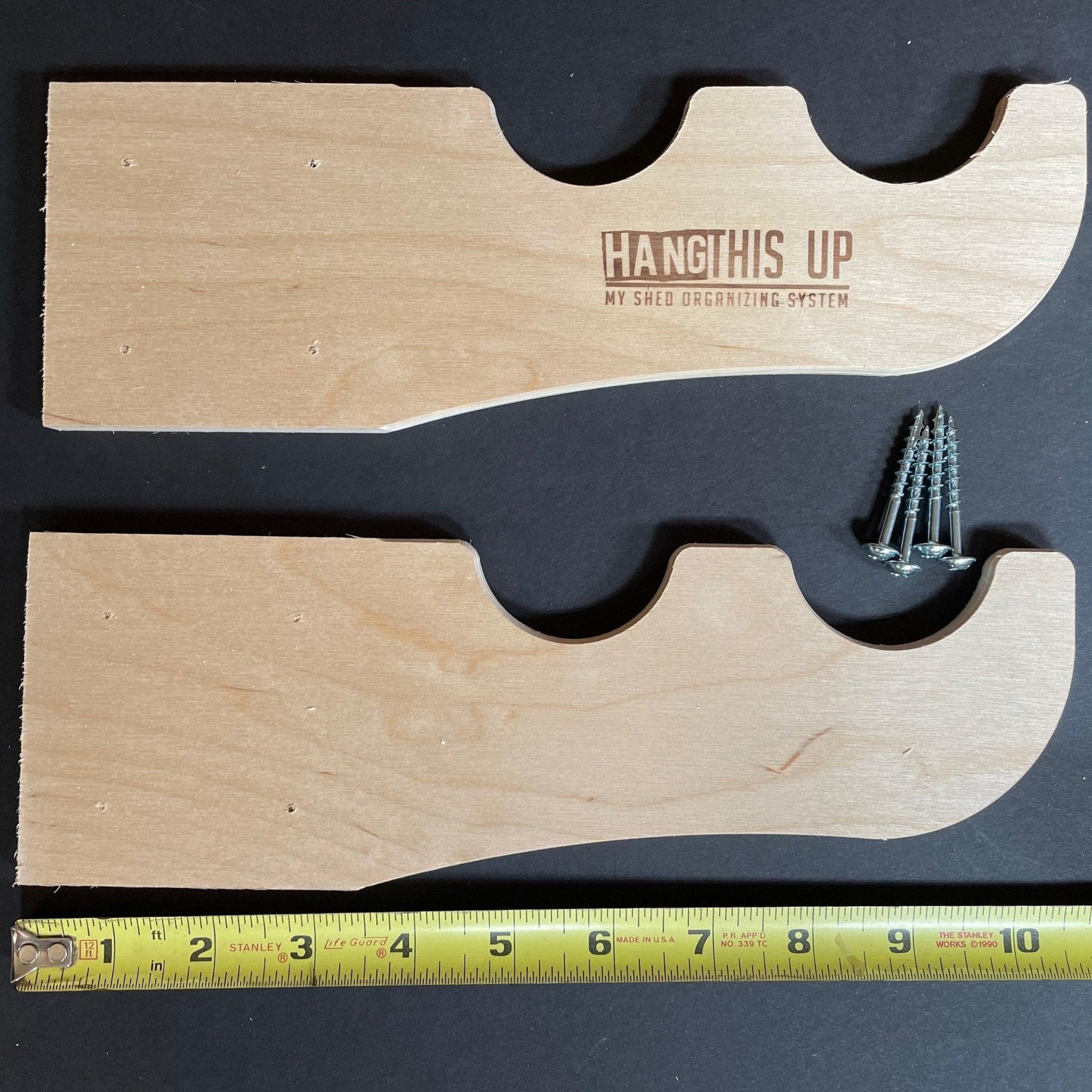 Our unique "stud mount" design gives added strength and our products "self level" when the device is placed against the exterior sheathing of your shed. Hangthis Up devices are custom designed to "fit" the variety of items you store in your shed so they look great when installed.