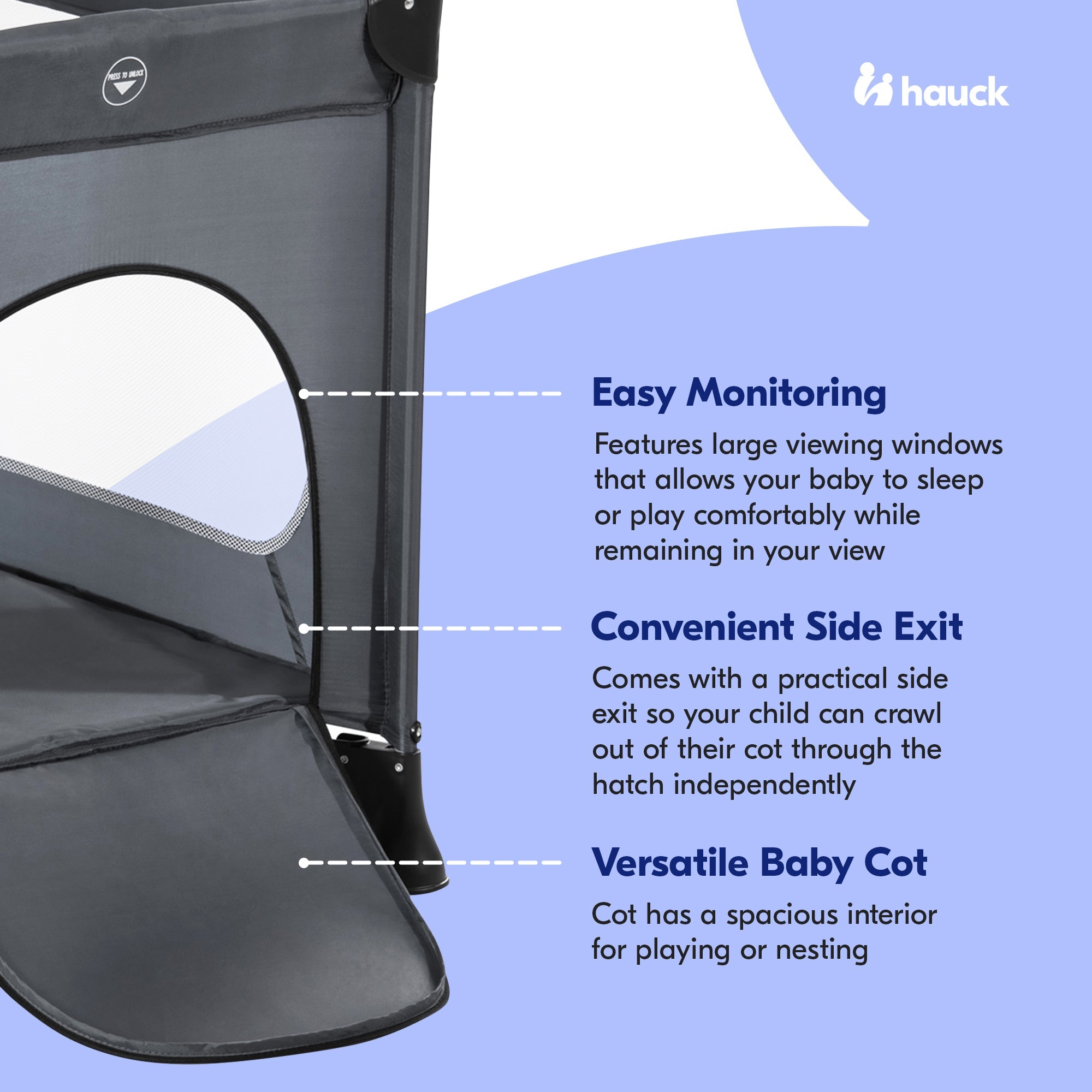 The hauck Dream'n Play features large, breathable viewing windows, allowing you to keep an eye on your little one as they sleep or play comfortably. This travel cot provides your child with the necessary sense of security, whether you're on the go or at home. The side zip, which can only be opened from the outside, allows children to enter and exit independently, ensuring hours of fun and freedom.