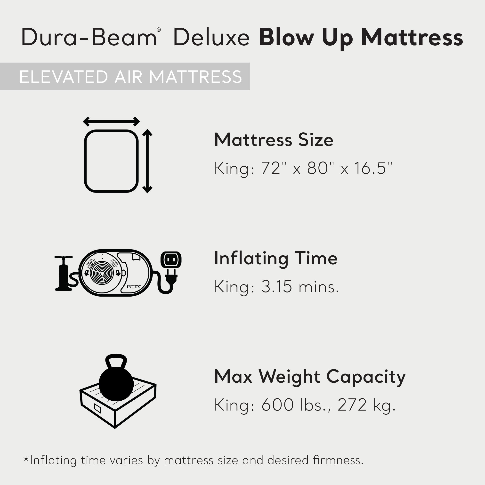 • Powerful internal pump for rapid inflation and deflation and approximate inflating time of 3.15 minutes for use right away