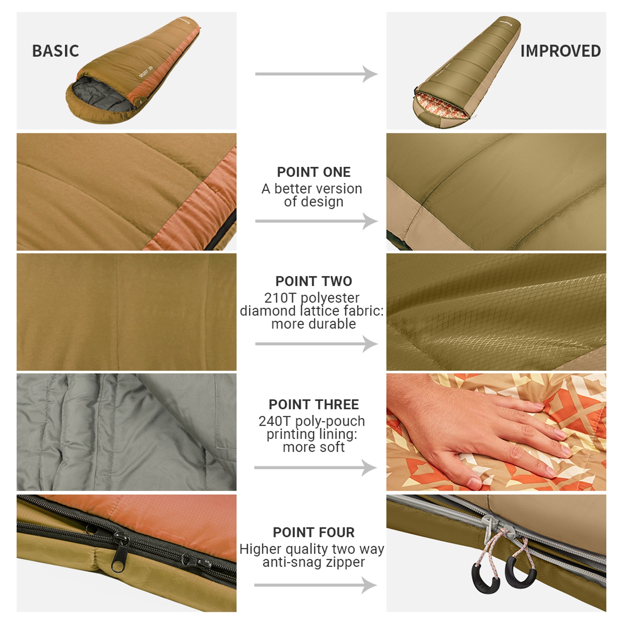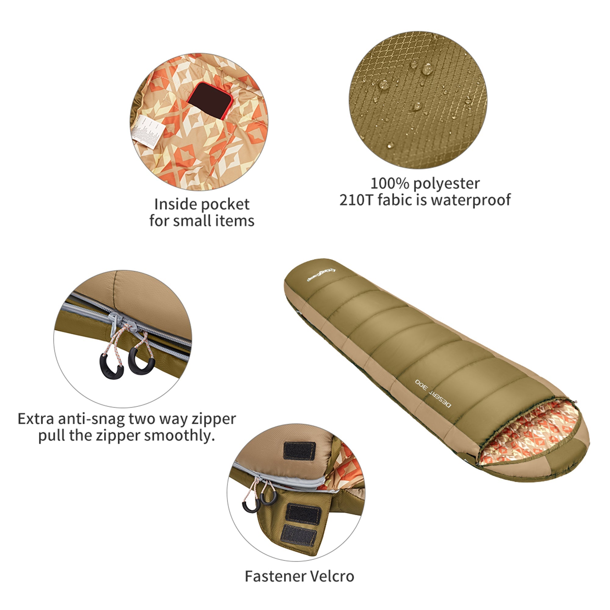 This sleeping bag is designed for cool nights with an adjustable drawcord to make the hood closer to the head, keeping out cold air. This compact sleeping bag is filled with 300g/m2 hollow fiber and is suited for three seasons of use (spring, summer, and autumn). This huge and tall sleeping bag has a temperature range from (Comfort) 32 degrees to (Limit) 23 degrees Fahrenheit. Measuring 84.6 by 31.5 inches, this sleeping bag can accommodate most people up to 6'4" and provides enough space to roll over and keep your body relaxed rather than tight. This bag features high-quality double-sided zippers that are snag-free and easy to use. This lightweight mummy sleeping bag comes with a travel-friendly compression sack that's simple and easy to hand wash.