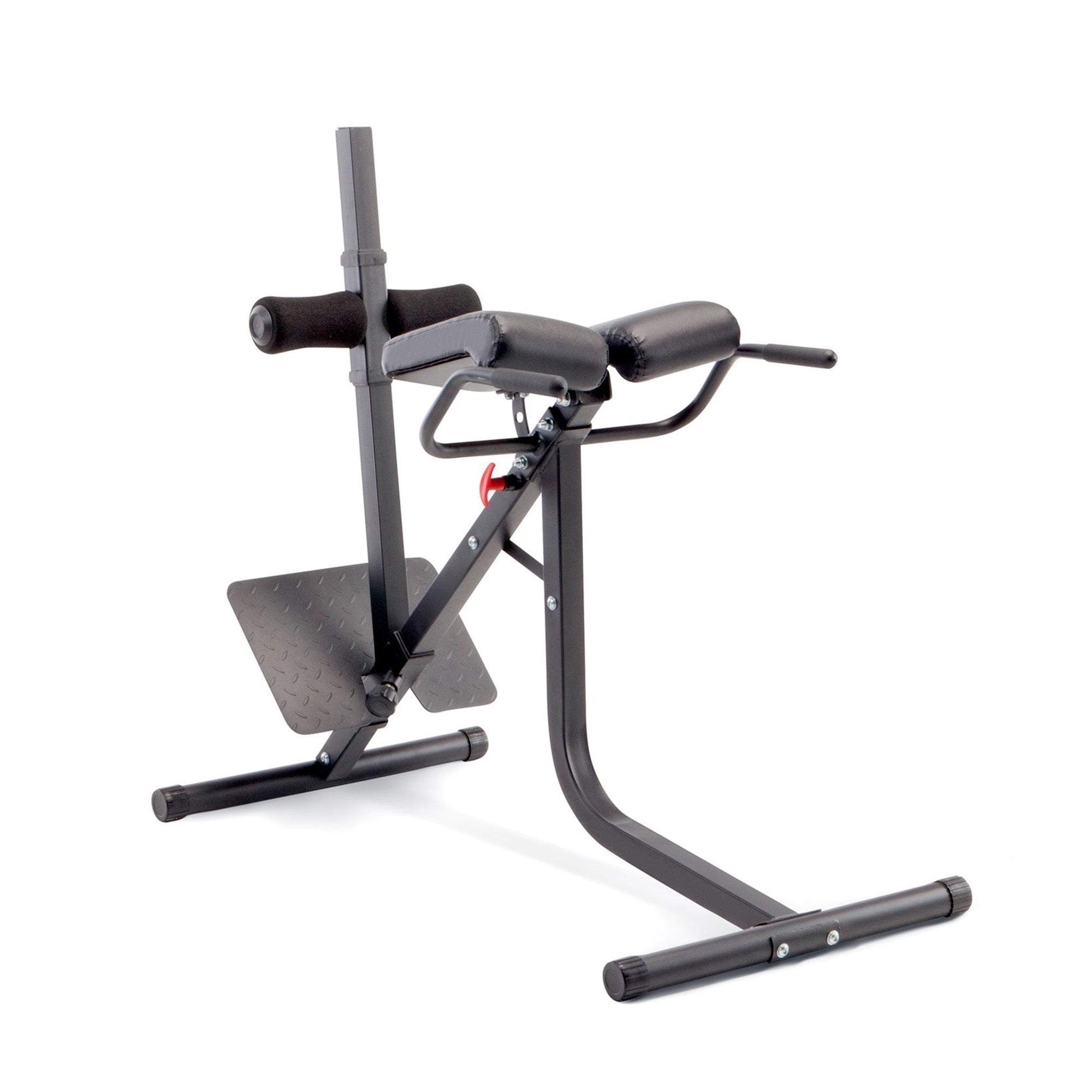- Hyperextension bench lets you sit and lean backward to develop your muscles