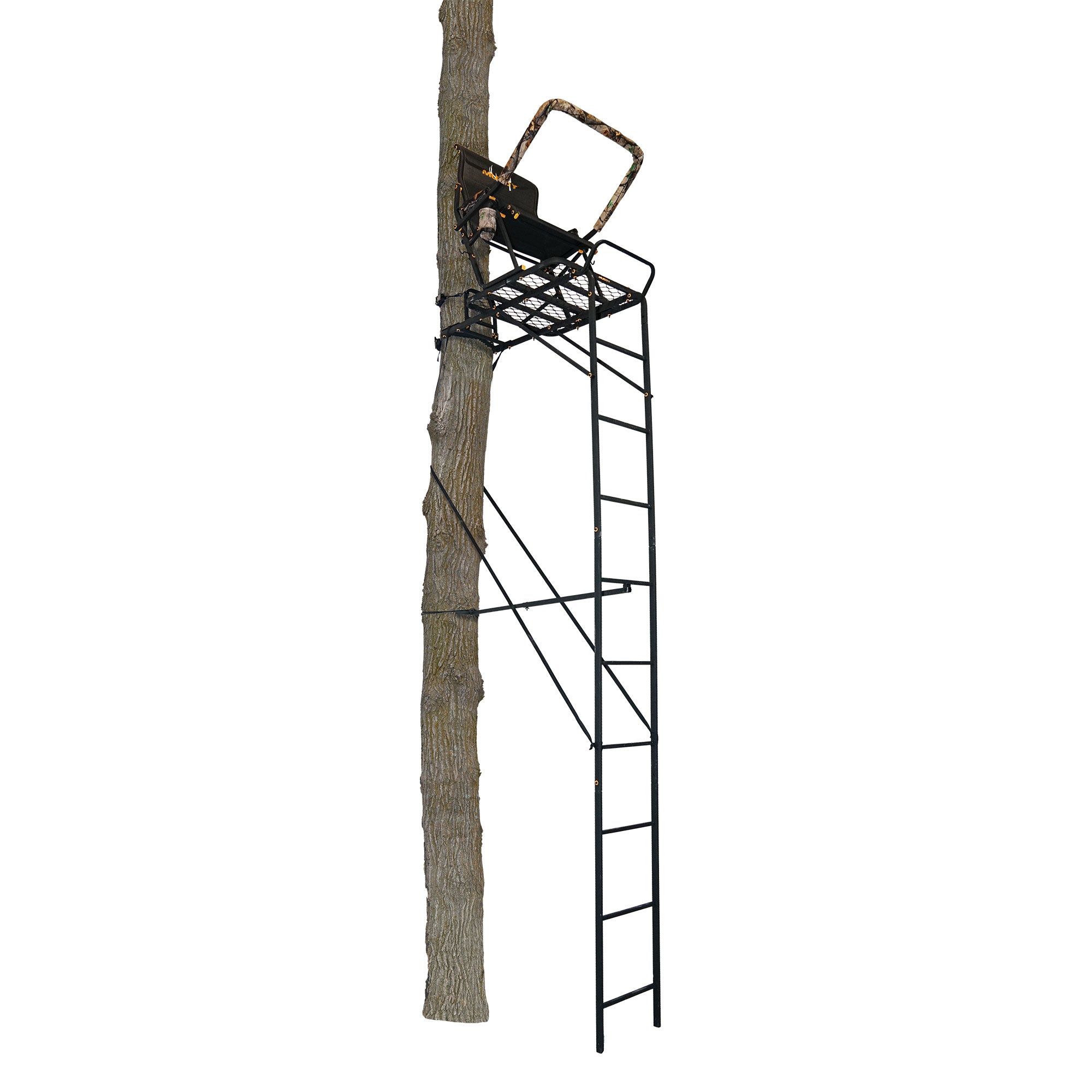 Take your hunt to the next level. The 17-foot Boss Hawg 1.5 Ladder Stand by Muddy is a comfortable, heavy-duty tree hunting stand built for convenience.