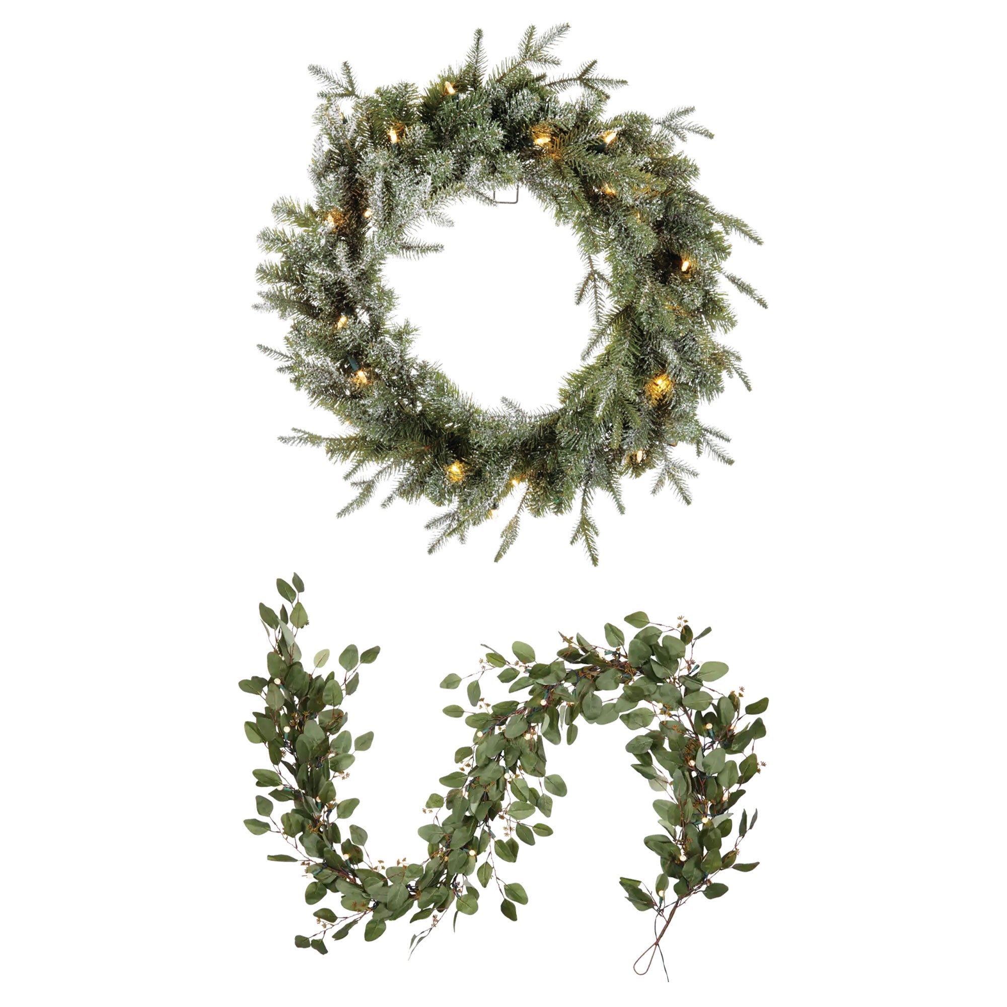 Elevate your home into a winter wonderland with the ultimate Noma holiday decor package. Noma's enchanting 24-Inch Pre-lit Frosted Fir Wreath and 9-Foot Pre-Lit Eucalyptus Christmas Garland Decor will capture the beauty of nature and infuse your space with the magic of the season.