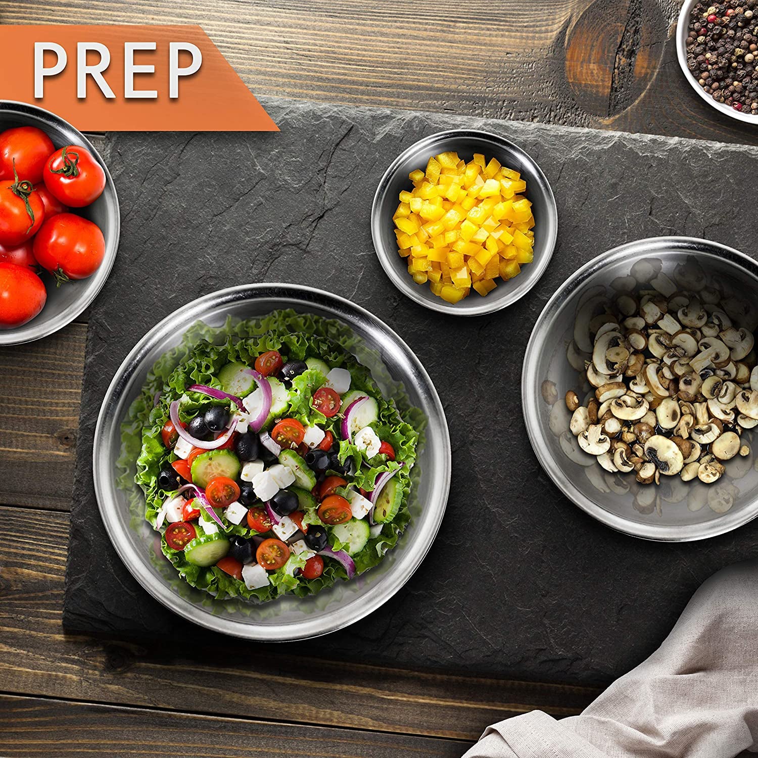 Featuring stainless steel construction and sleek polished mirror finish, this food prep bowl set is both durable and attractive. This durable and reliable metal food bowl set is perfect for food prep, serving, marinating, mixing, and more. The 6-piece set includes (1) 3/4-quart bowl, (1) 2-quart bowl, (1) 3-quart bowl, (1) 4-quart bowl, (1) 5-quart bowl, and (1) 8-quart bowl.