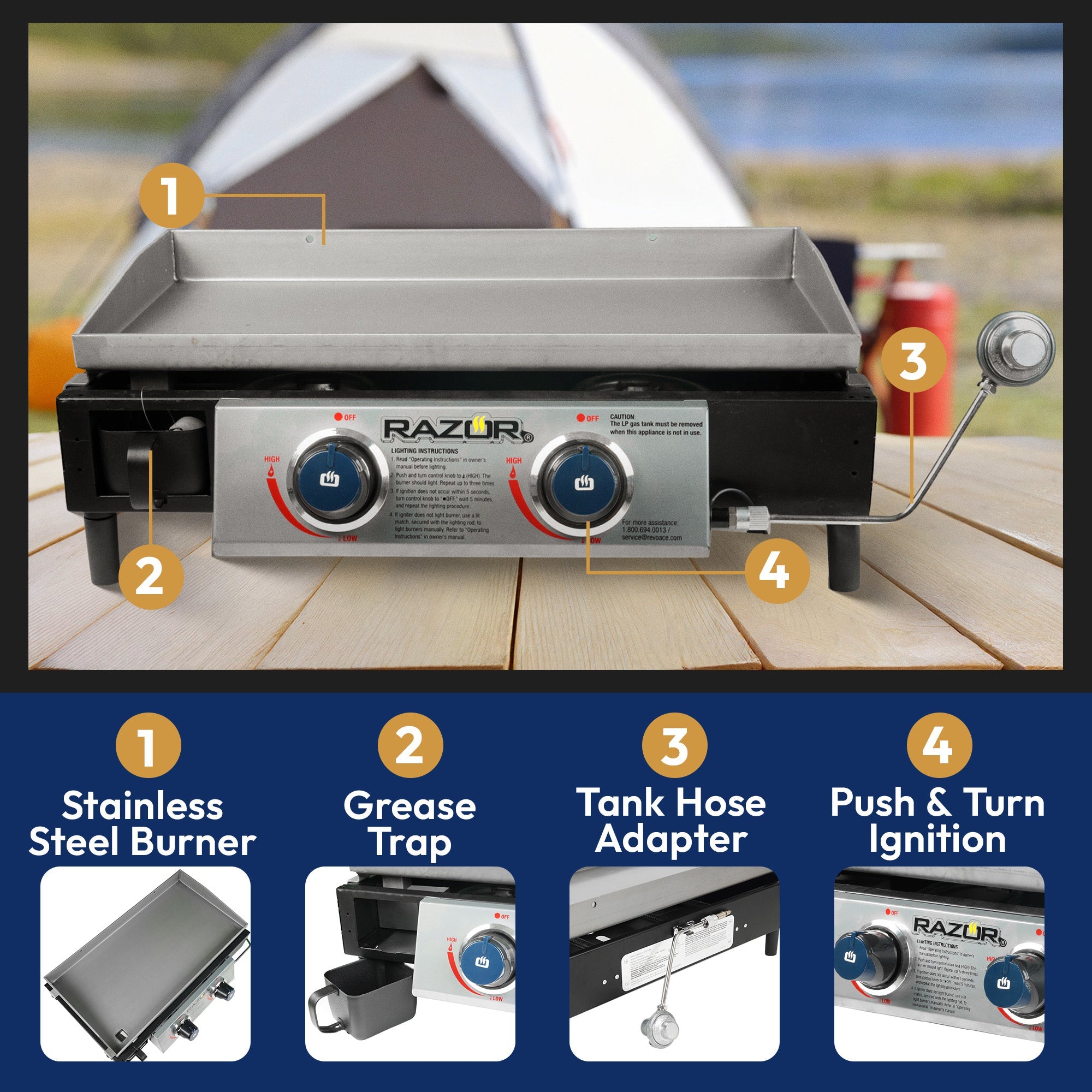 - Razor Griddle 25-Inch Portable Double Burner LP Propane Gas Grill, Steel