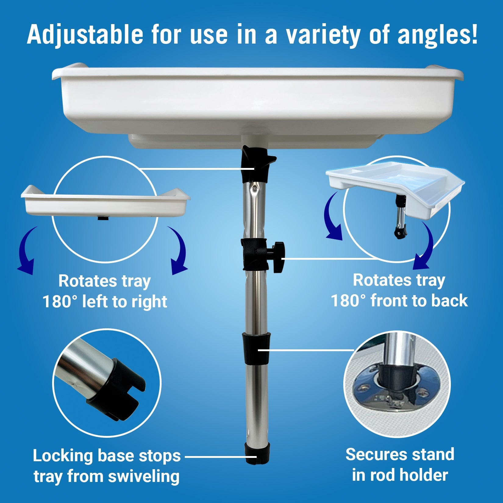 • ADJUSTABLE FOR VARIOUS ANGLES: Our fillet table for boat has a dual adjusting arm to work with straight and angled rod holders. You can tilt it left to right and back and forth. Easily remove it for cleaning and storage unlike other bait trays.