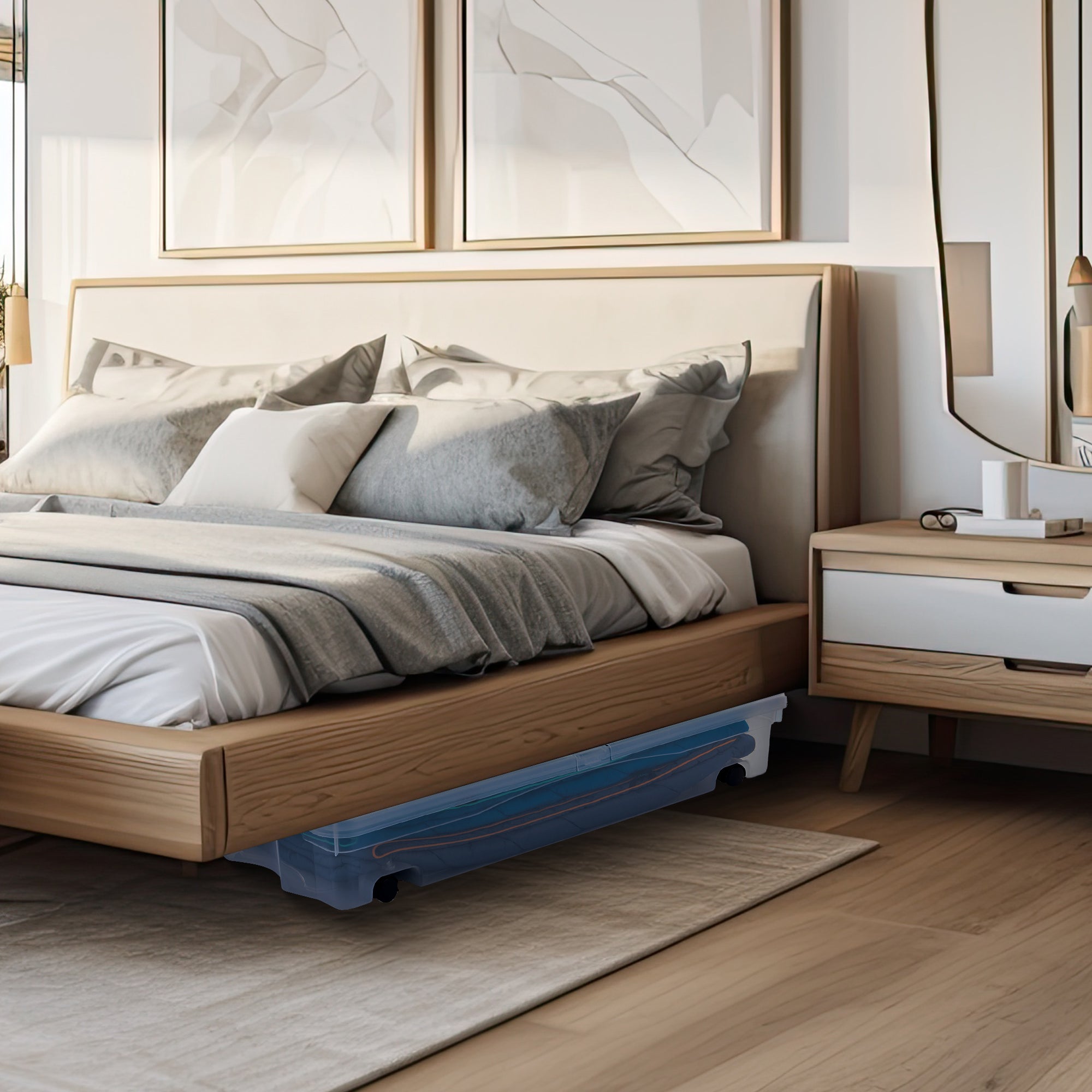 - These 70-quart under-bed wheeled storage boxes are great for storing non-everyday items such as additional bedding, clothes, wrapping paper, décor, and more