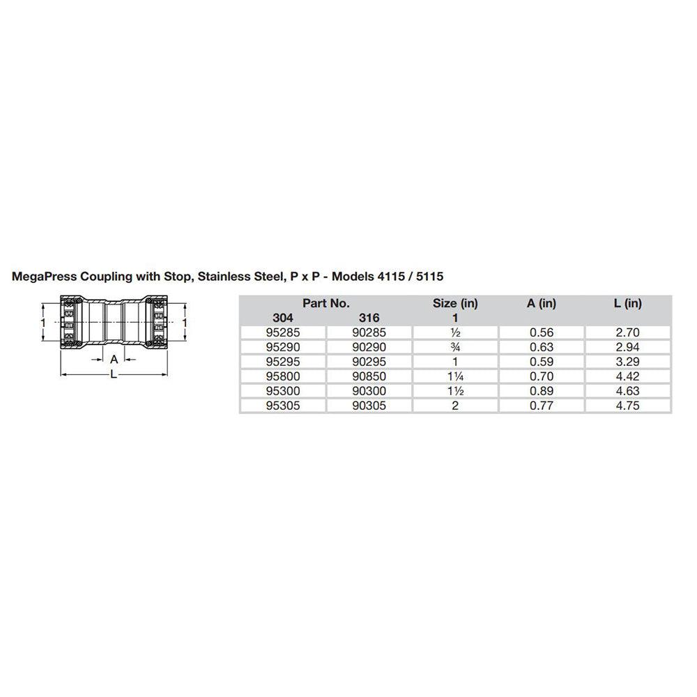 MegaPress 3/4" Stainless Steel 304 Coupling with Stop - Double Press Connection - Smart Connect Technology