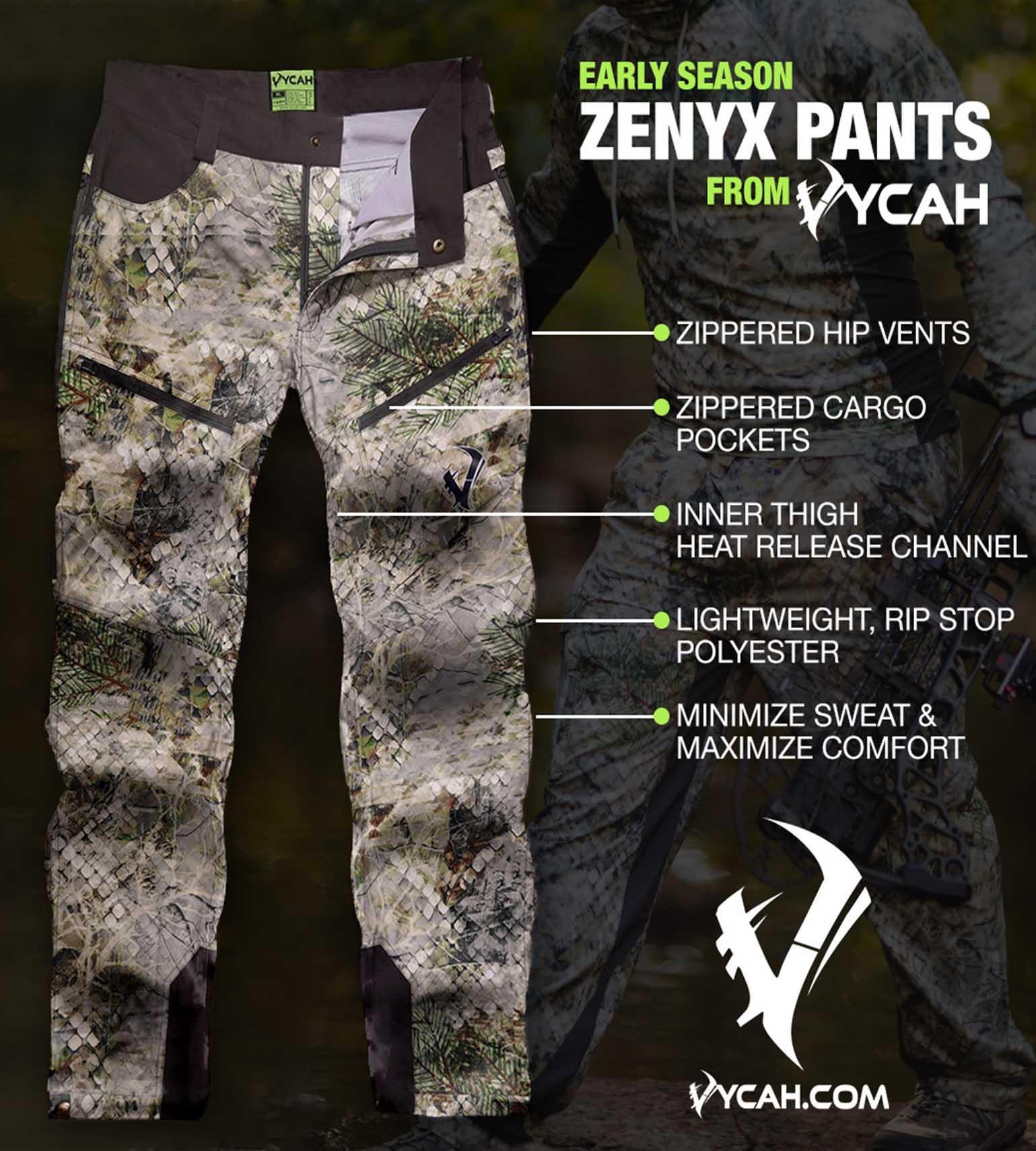 For the early season hunter, it’s all about high risk/high reward. If you’re willing to brave the bugs and heat the payoff can be huge. Vycah’s Zenyx Pant is designed to make those early season hunts a breeze. Designed with built-in zippered hip vents, and heat release strips throughout, the Zenyx will help minimize sweat and maximize comfort.