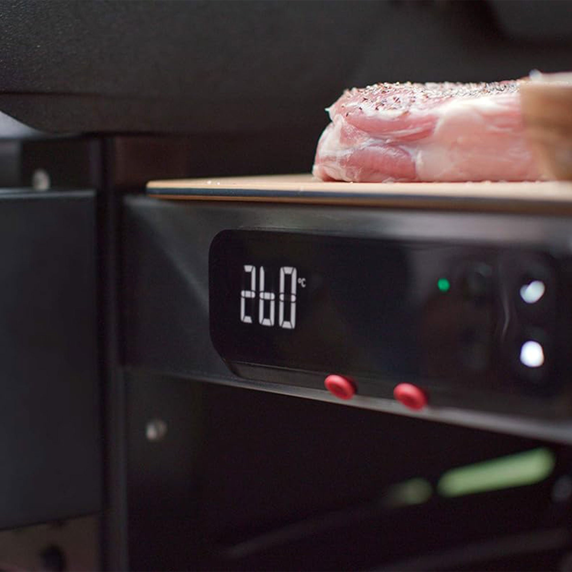- Built-in digital LED display shows real-time food and grill temperature, food readiness countdown, connectivity status, fuel/battery status, and audible notifications and alerts