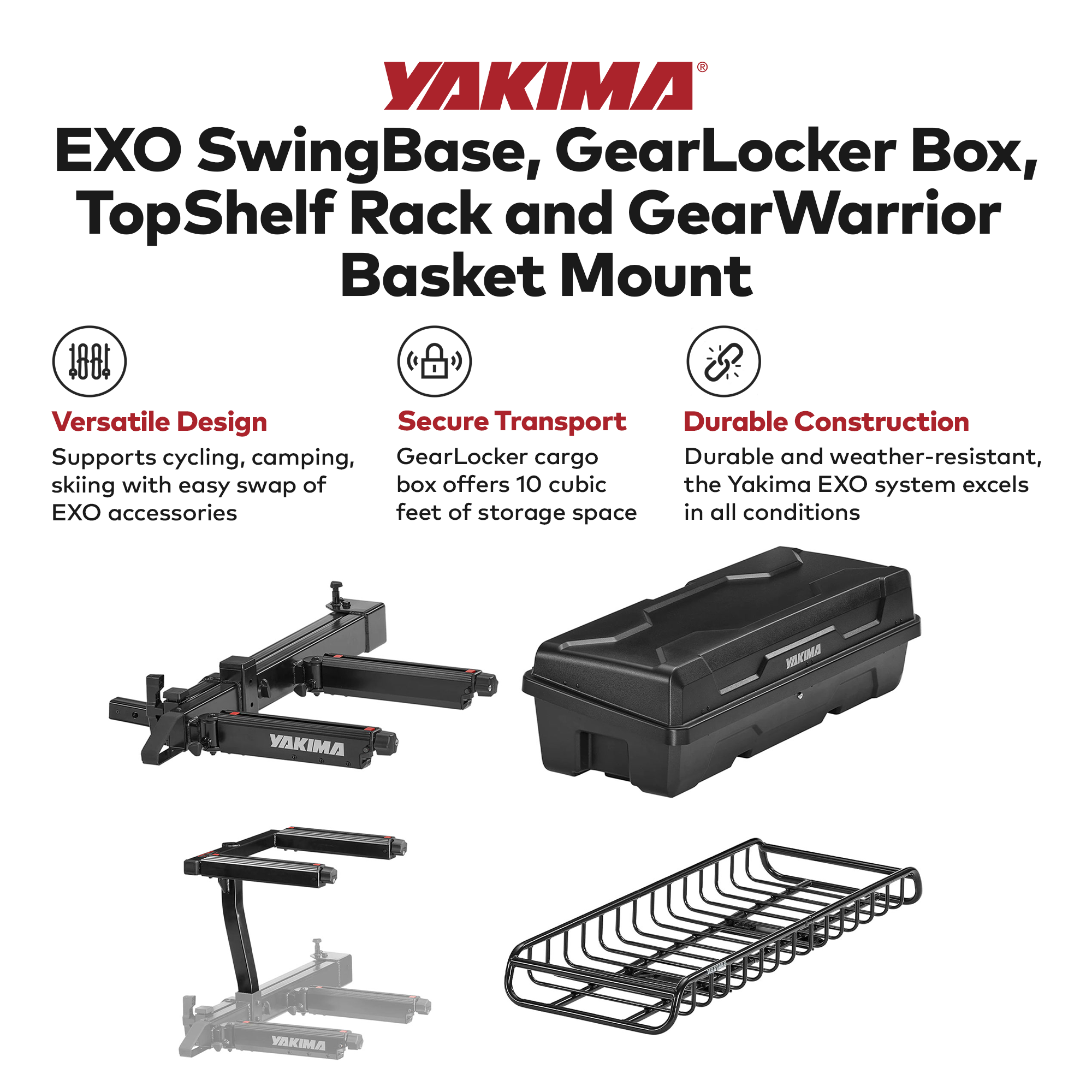 Embark on thrilling adventures with the Yakima EXO SwingBase Hitch Base Rack with GearLocker Cargo Box, TopShelf Rack, and GearWarrior Basket Mount. ensuring all your essentials are covered.