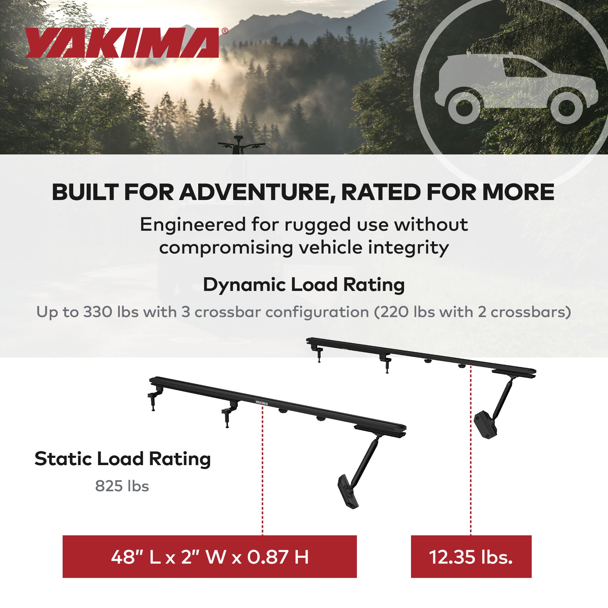 - Off-road rated with a dynamic load capacity of 330 pounds and a robust static load capacity of 825 pounds, this rooftop track system by Yakima is designed for extreme adventures, providing the ultimate support for your vehicle's hardtop
