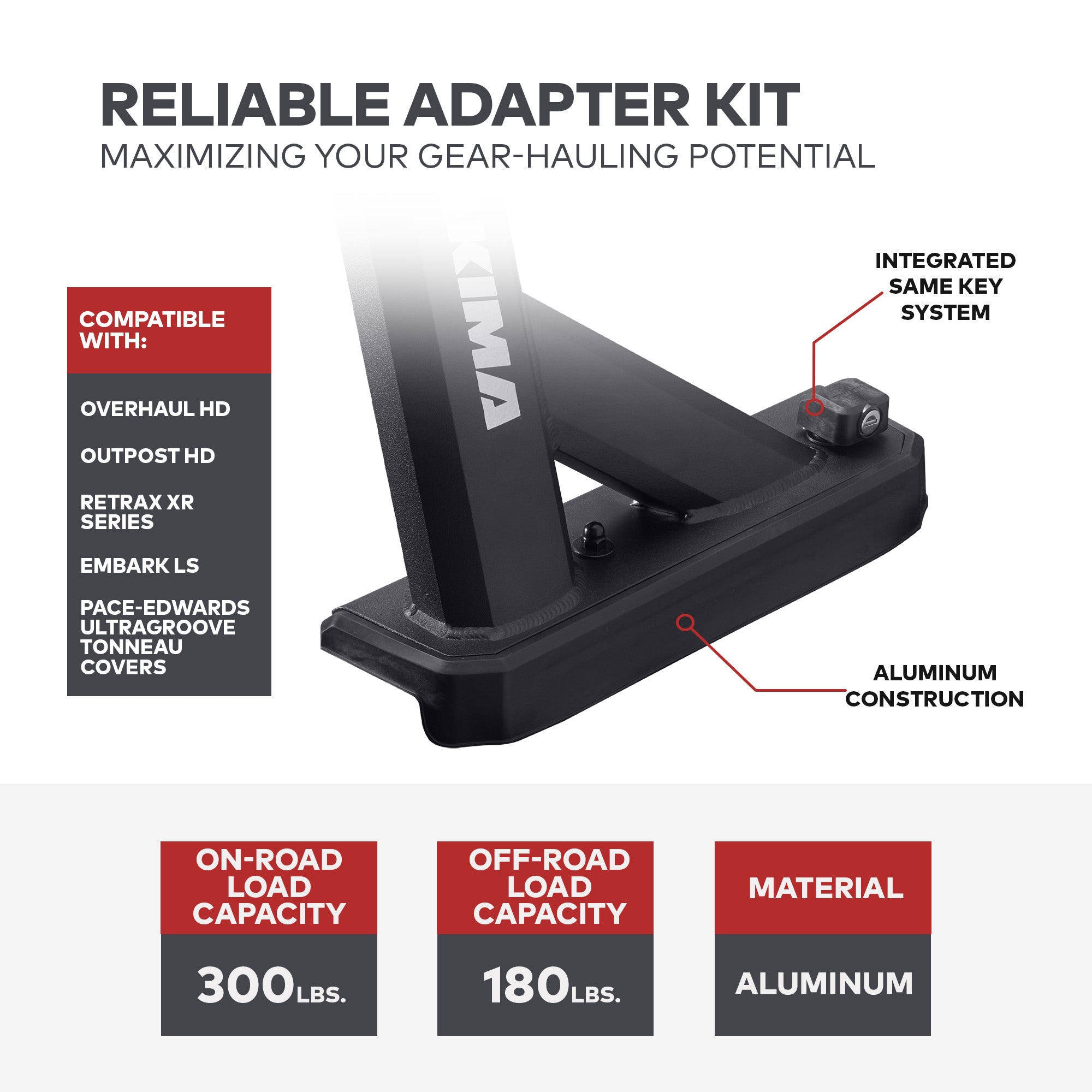- Reliable adapter kit seamlessly merges Yakima's OverHaul HD and OutPost HD systems with Retrax XR series, Embark LS, and Pace-Edwards UltraGroove tonneau covers, expanding your truck's functionality without sacrificing security